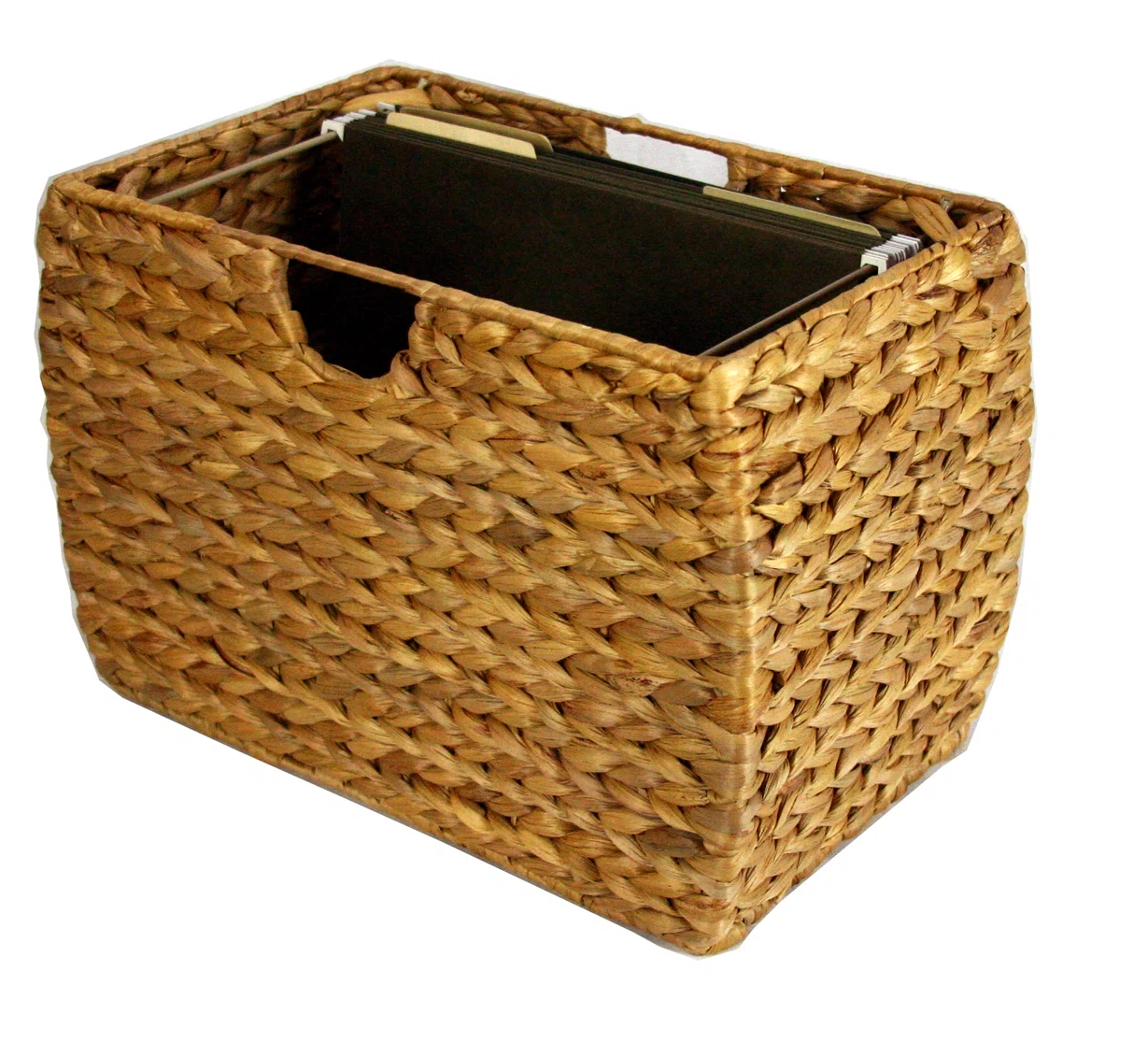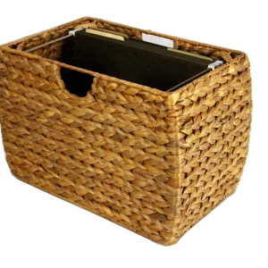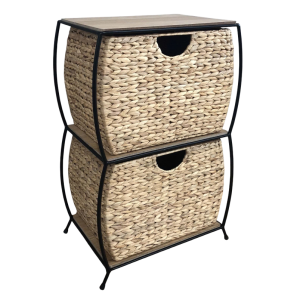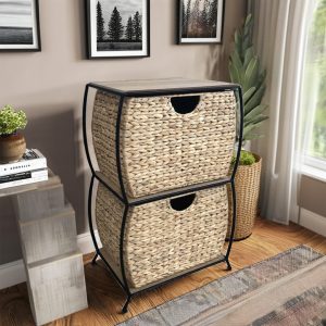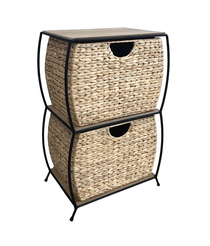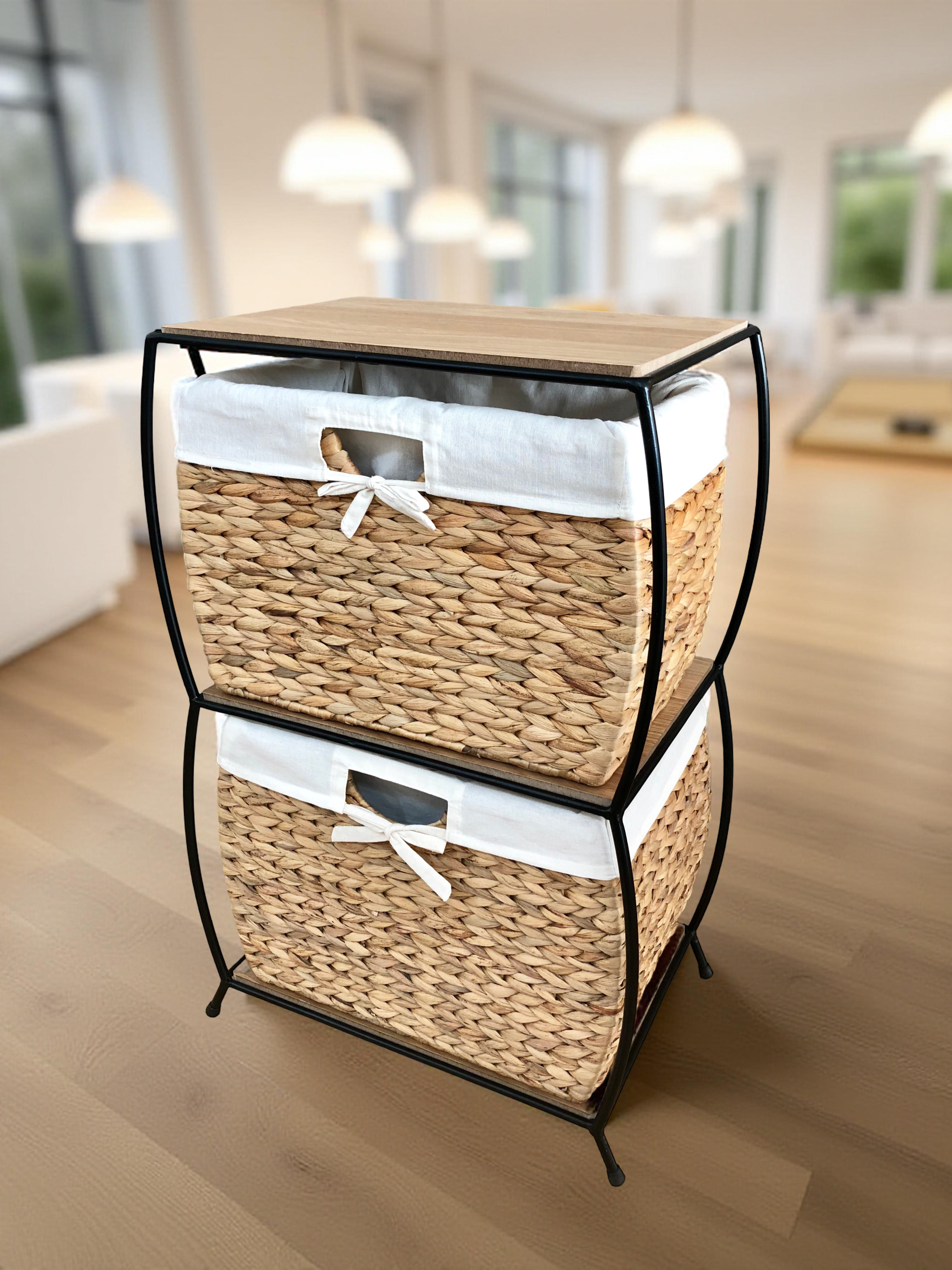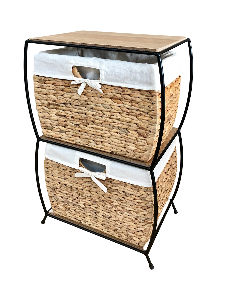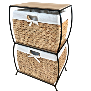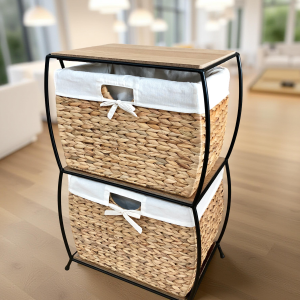 This storage unit features a distinctive curved metal frame that gracefully arches around two woven wicker baskets, creating a smooth, flowing silhouette. The baskets themselves are also curved, with rounded edges that complement the frame’s gentle arcs, giving the piece a cohesive and elegant appearance. This versatile piece is well-suited for a variety of uses, particularly in business or home offices. It can serve as a stylish filing system for documents and paperwork, or as a storage solution for office supplies like notepads, pens, and other essentials. Its compact, curved design makes it an attractive yet functional addition to workspaces, helping to keep clutter organized while adding a touch of modern elegance. When not used for filing purposes, the baskets are lined with stylish front-tied white fabric.