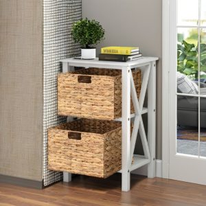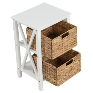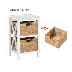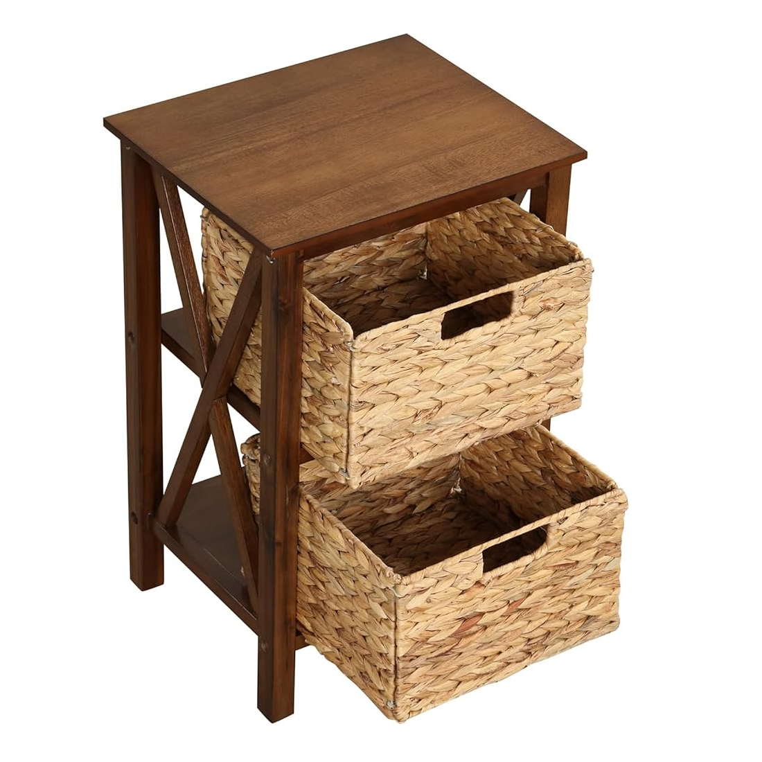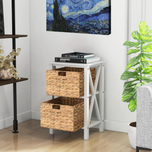 This versatile piece can be called a nightstand, side table, storage cabinet, or small accent table, thanks to its compact size and functional design. It features two woven wicker baskets that serve as drawers, providing discreet storage for small items, valuables, or essentials. The wooden frame adds a rustic charm, complementing the natural textures of the baskets, while the side cutouts make it easy to pull out the drawers. This furniture piece t is perfect for use in various settings, such as beside a bed as a nightstand or in a living room as a side or end table for magazines, remote controls, eyeglasses. It can also serve well as a work desk organizer to hold your office supplies, paperwork, and personal belongings.