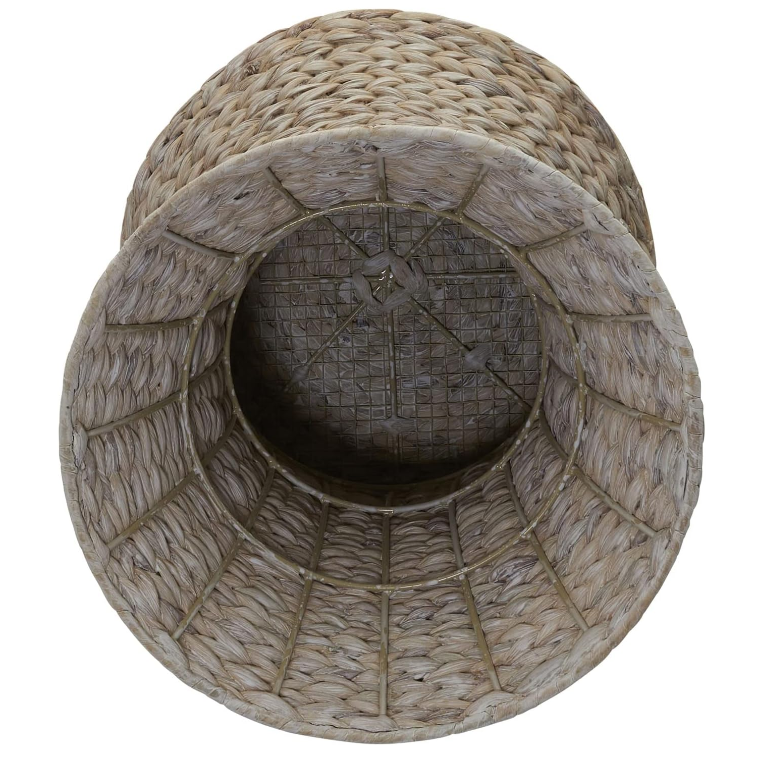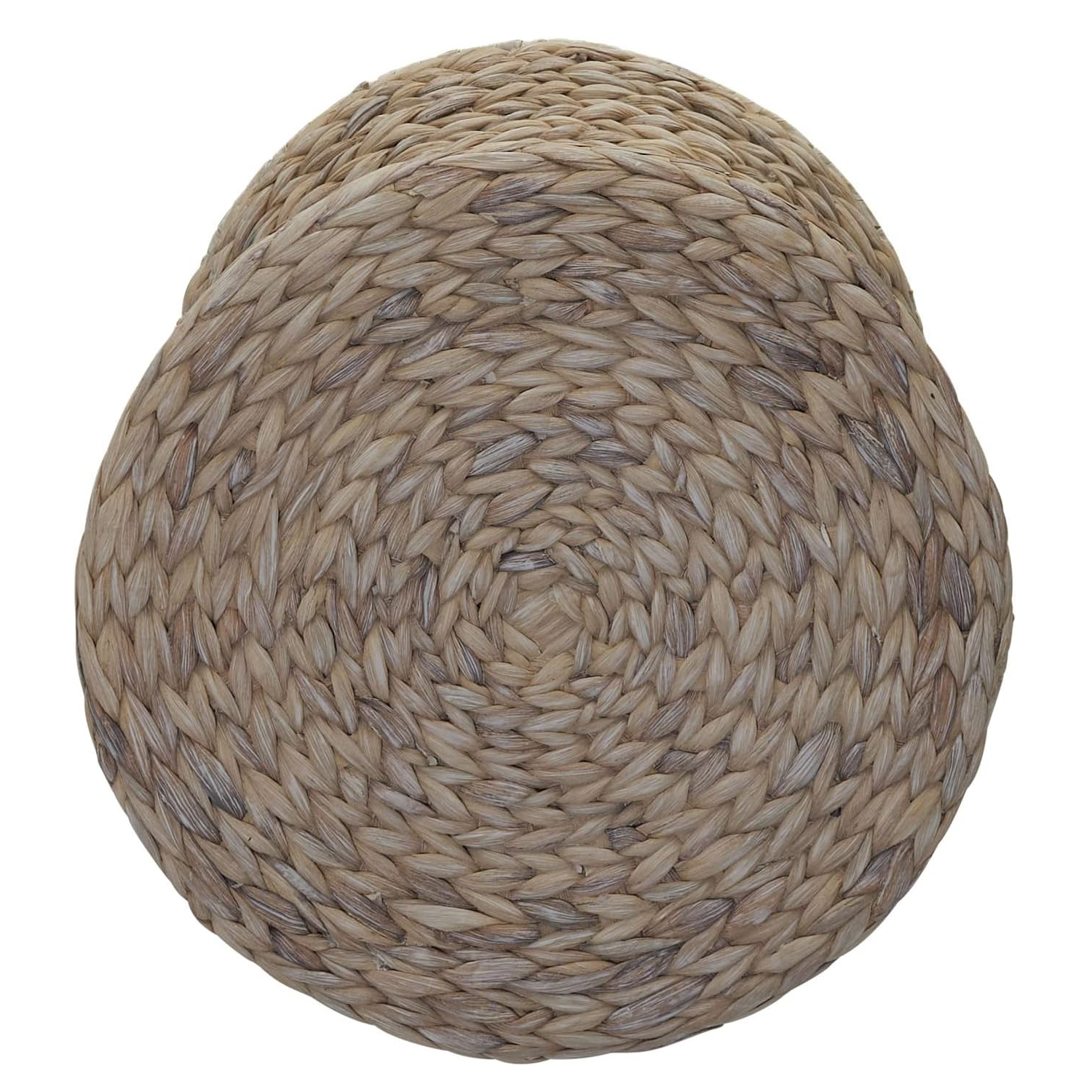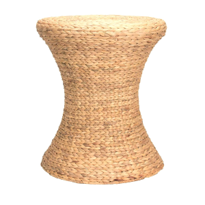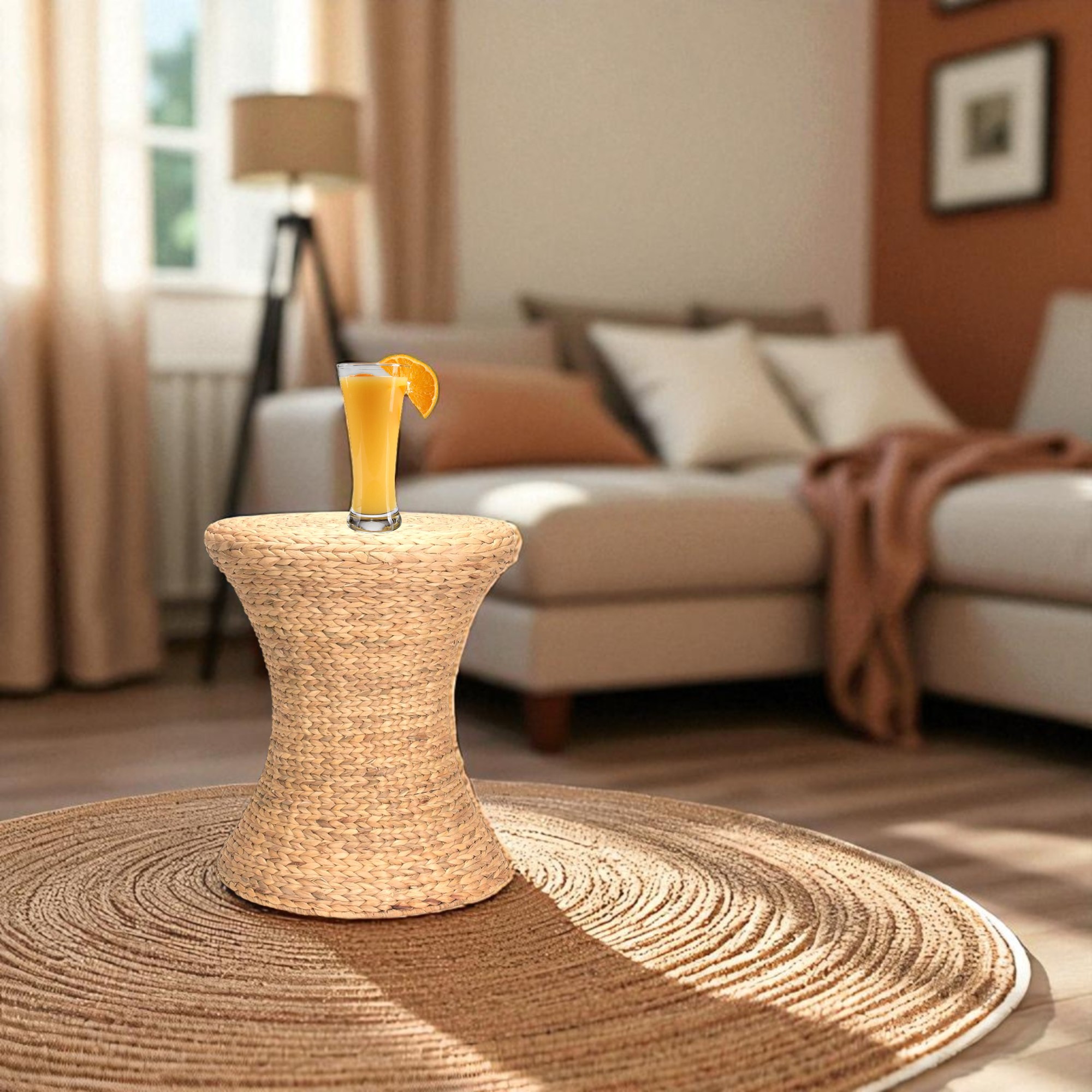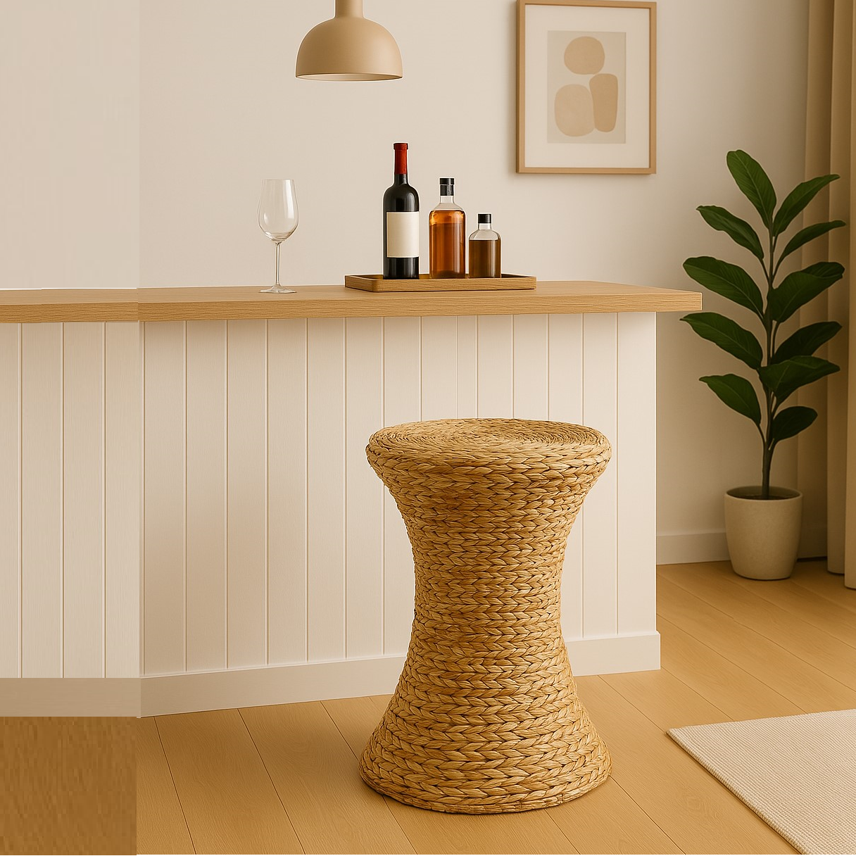 This wicker stool table, with its distinctive hourglass shape, is crafted from water hyacinth, featuring a natural, woven texture and a light, neutral color typical of natural fibers. Its sturdy construction and wide, flat top make it highly functional, allowing it to double as a stool when needed. The versatile design makes it suitable for both seating and as a decorative surface, perfect for outdoor or casual indoor settings, adding a rustic and organic touch to both household settings (living room, patio, bedroom, dining room) and commercial spaces (hospitality).