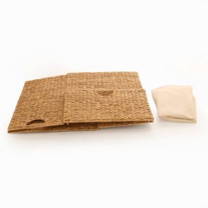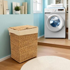 The laundry hamper is a stylish, rectangular, foldable storage piece crafted from natural plant fibers with tight weaving. It features a hinged lid on top for convenient access, while the interior is lined with a soft, white fabric liner that protects clothes and facilitates cleaning. On the front side, a small half-round cutout functions as a handle or vent, and additional cutouts are located on both the left and right sides, serving as ergonomic handles for easy lifting and carrying. Its main part designed to be foldable when not in use, the hamper offers versatile storage options. Overall, the hamper combines practicality with a natural look; it’s well-suited for bedrooms, bathrooms, or laundry nooks.