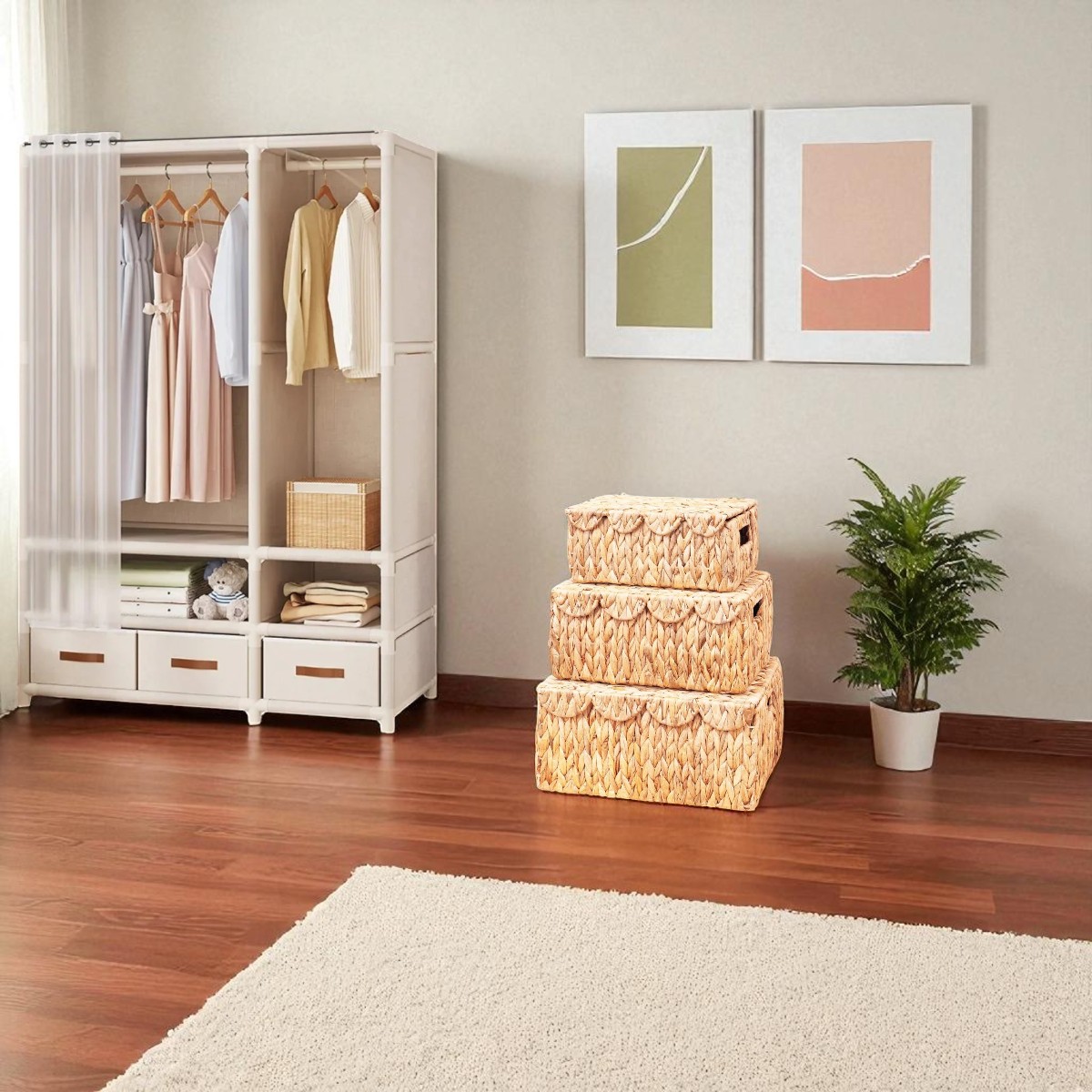Other names Handcrafted gift box; natural fiber storage bin; scalloped edge storage basket; boho wicker basket; artisan woven storage chest (for larger sizes); wicker picnic basket; decorative woven toy storage box