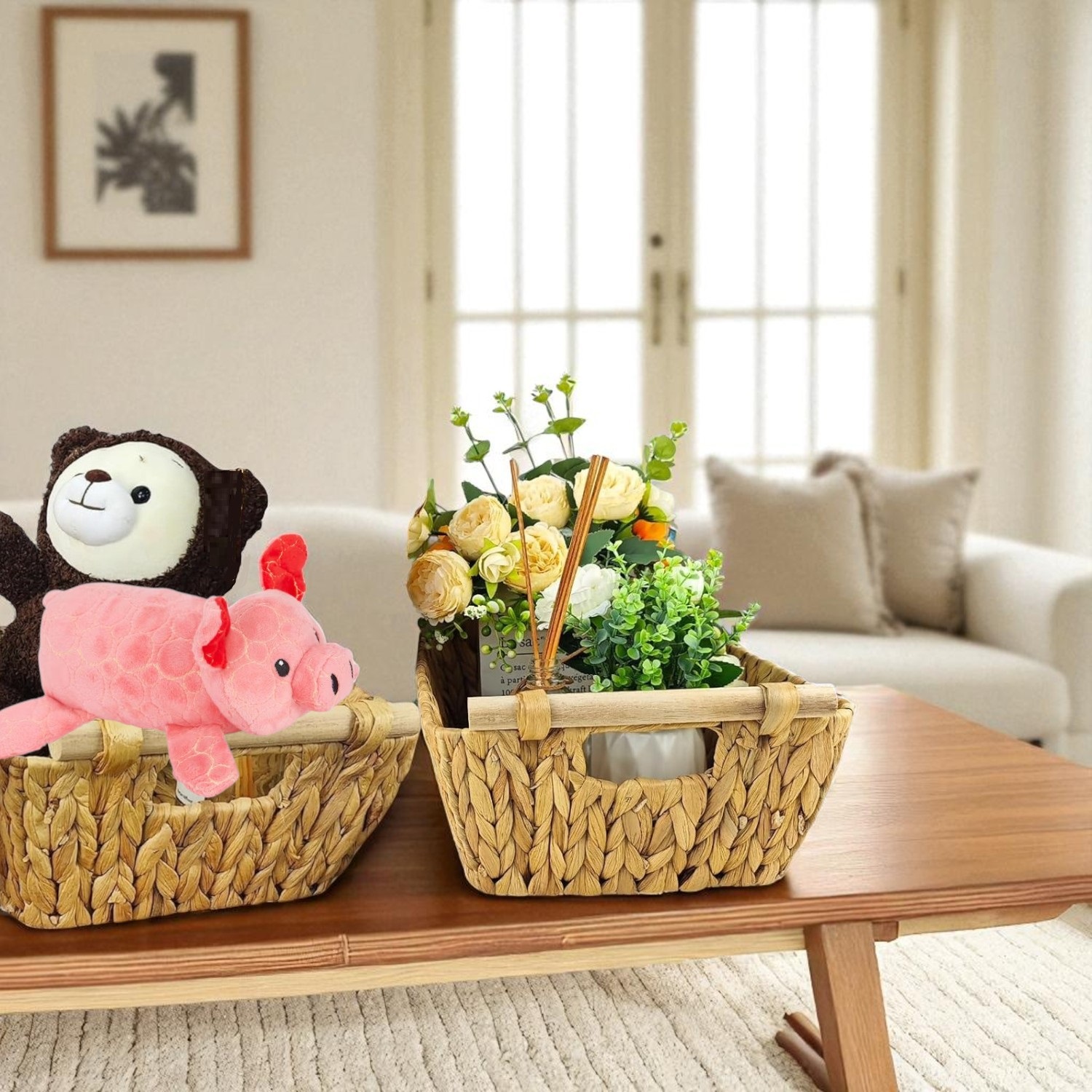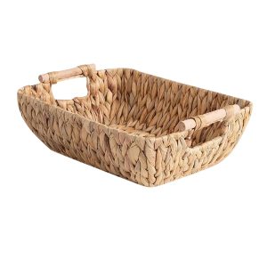 These are two rectangular tray-style baskets crafted from water hyacinth, featuring eco-friendly, sturdy, and elegant acacia wood handles. The straight wooden handles provide a comfortable grip and add a touch of sophistication to the rustic design. These versatile baskets are ideal for storing fruits, snacks, spices, or household essentials, and can be used in the kitchen, bathroom, or for other decorative storage purposes. With a strong frame structure, they support a good weight capacity. Their natural appearance and durable handles make them both functional and stylish for any space, residential or commercial.