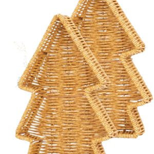This tray is crafted from natural rattan and features a pointed, triangular outline resembling a stylized evergreen Xmas tree. The weaving pattern is tight and consistent throughout, with a natural, light brown color that emphasizes the handcrafted quality. This tray is ideal for festive décor or serving holiday treats in a seasonal, rustic style. Their simple yet charming design captures the spirit of Christmas while offering functional space for display or serving purposes. Additionally, it can be used to hold and present a Christmas gift set, making them versatile and decorative containers for holiday gifting or presentation.