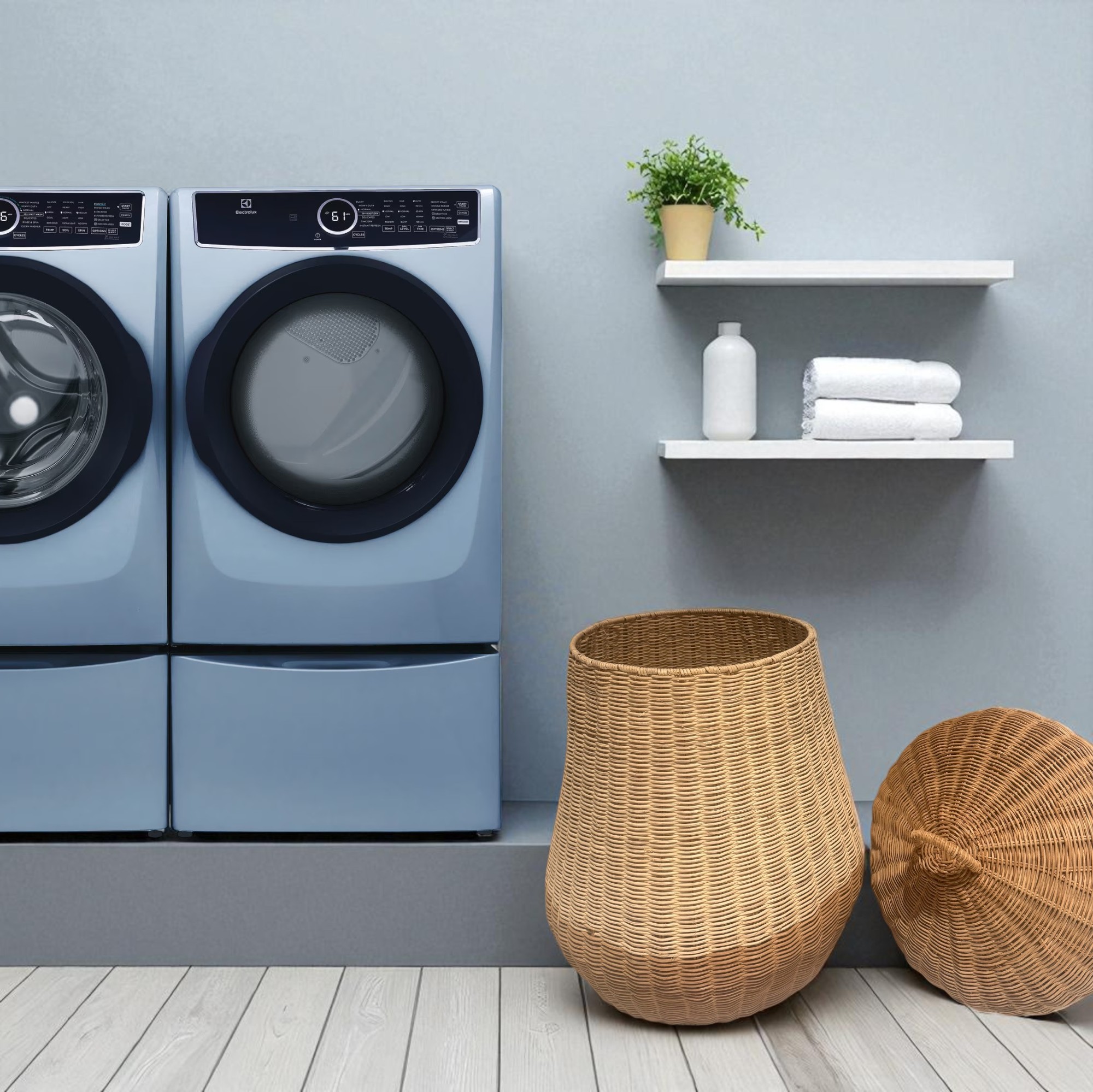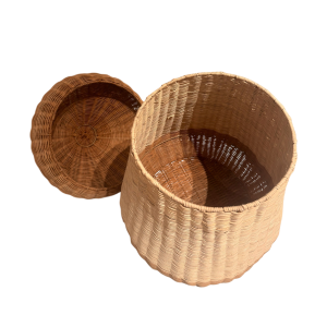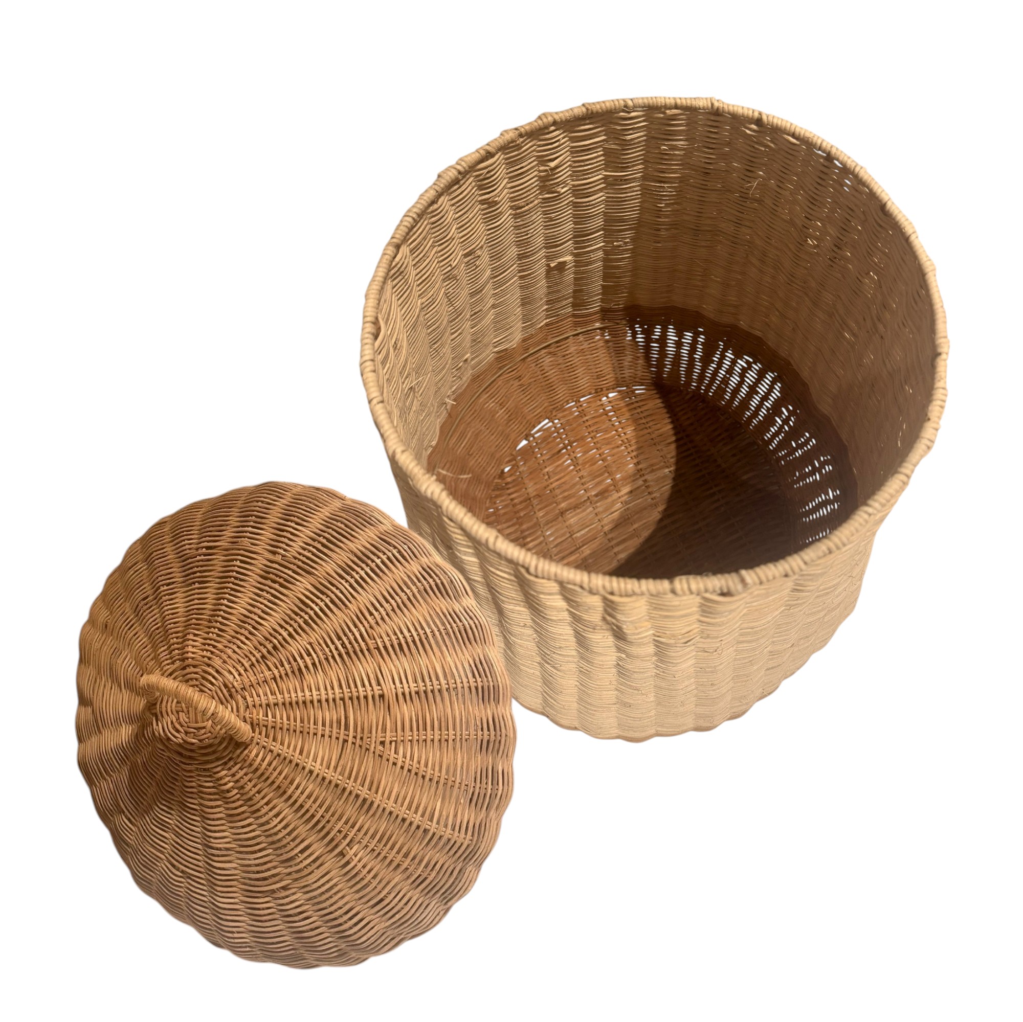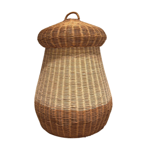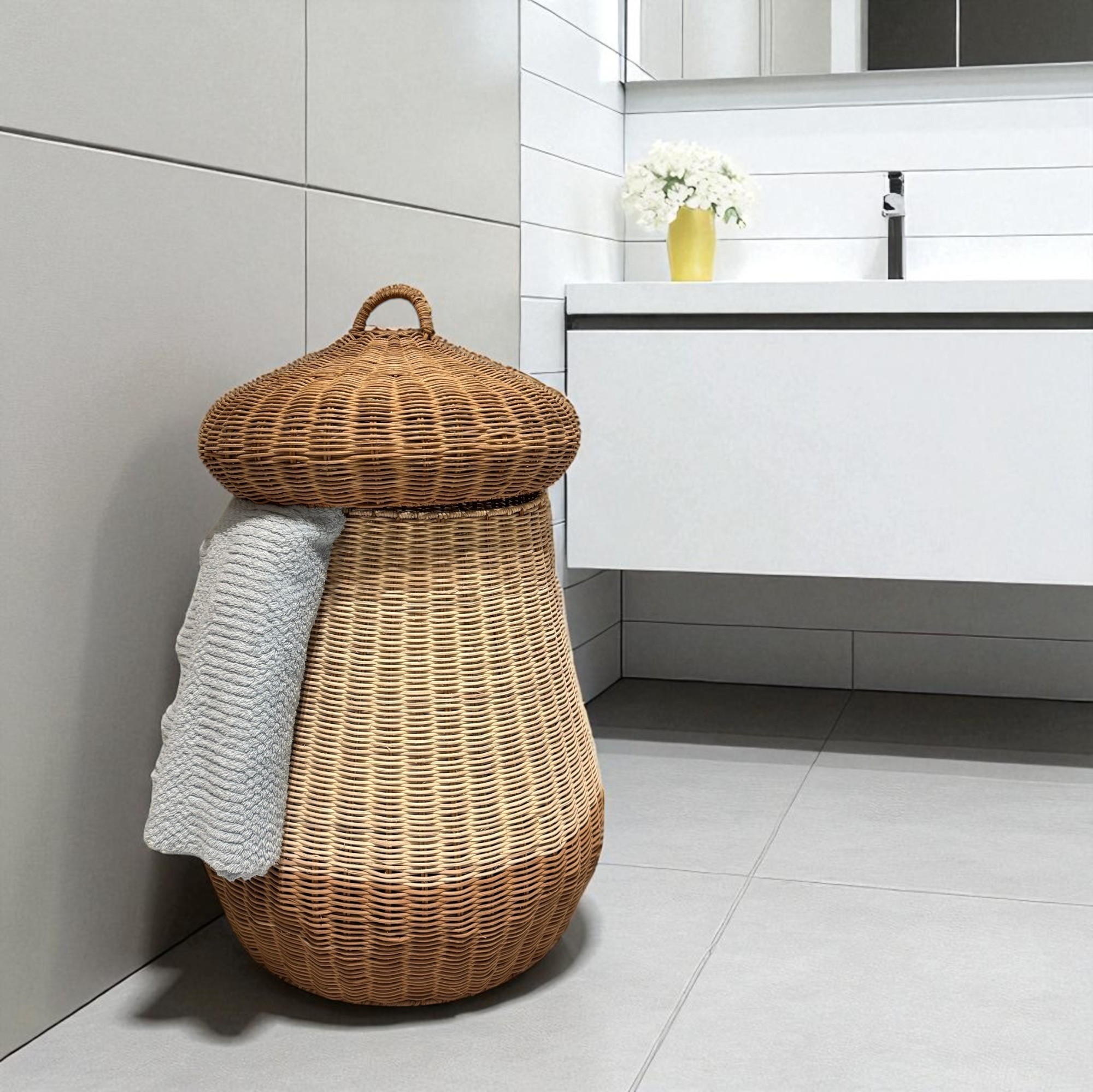 This rattan-crafted hamper features a charming mushroom-like silhouette when the lid is closed, with its dome-shaped top and rounded body mimicking the natural form of a toadstool. The base gently curves outward from a smaller footing, creating a bulbous, organic shape that tapers slightly near the top before flaring into the wide lid. The lid itself is intricately handwoven with a raised center and a looped handle for easy lifting, blending seamlessly into the overall form. Crafted in two gradient tones (natural rattan and light brown), this hamper serves both as a functional storage piece and a whimsical accent for bathrooms, bedrooms, or relaxed living interiors. Especially fit for kids, both boys and girls, to store laundry, toys, and other essentials.