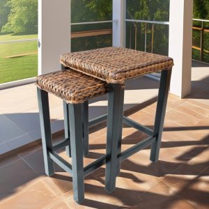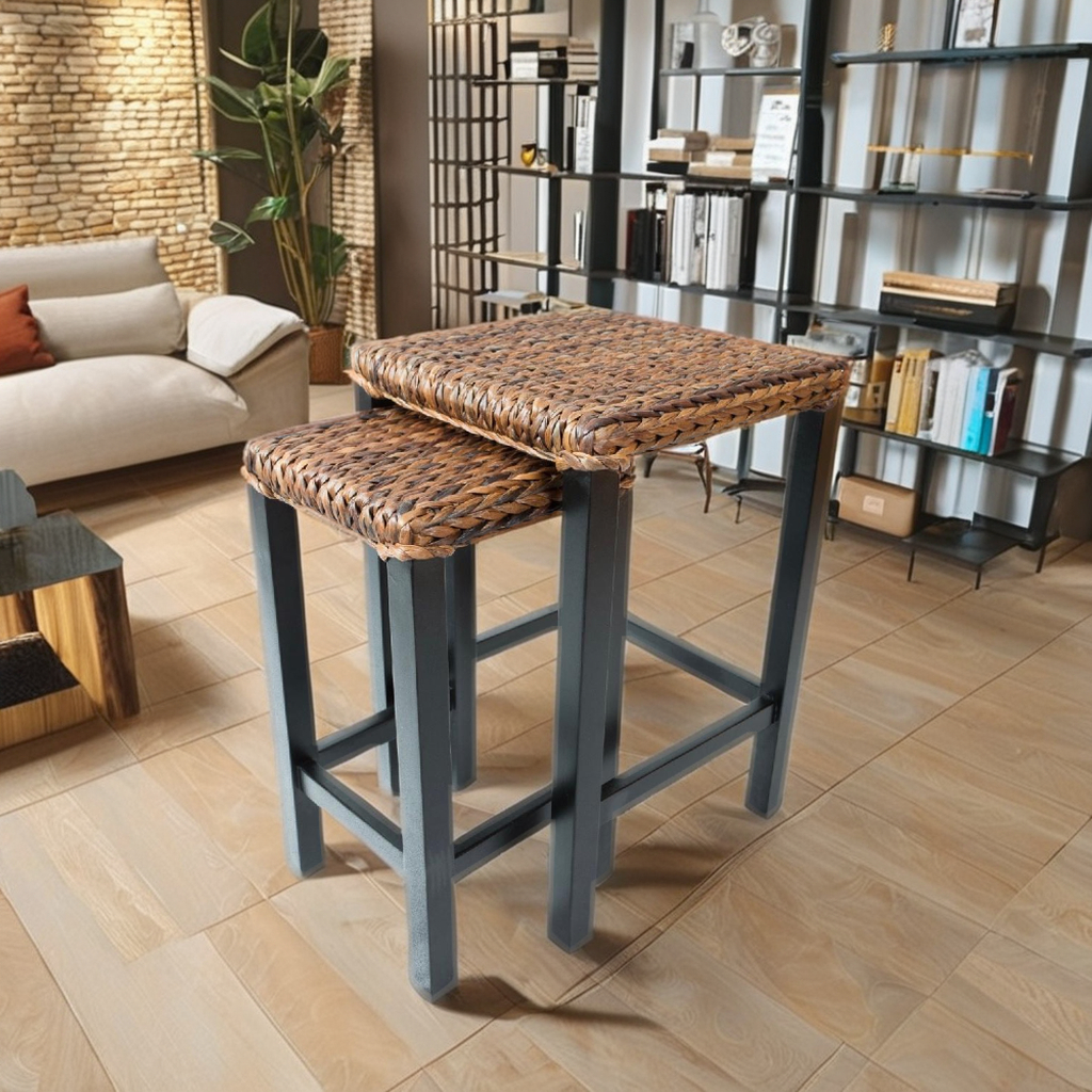 These two nested side tables feature woven water hyacinth tops paired with sleek black wooden legs, creating a stylish blend of natural and modern design. The larger table offers ample space for drinks, snacks, books, or decor, while the smaller one provides versatile extra surface area. Their compact, nesting design makes them perfect for small living rooms or apartments, fitting easily beside a sofa or armchair. They are also ideal for use in a cozy patio or balcony, adding charm and functionality to outdoor seating areas. They’re equally good for residential/ commercial swimming pools, hotel lounges, and similar amenities.